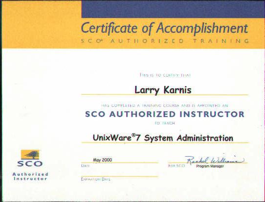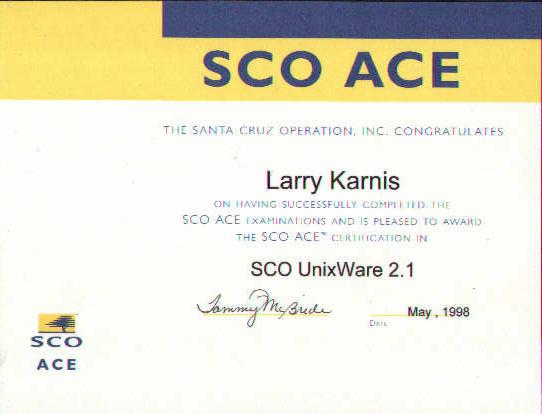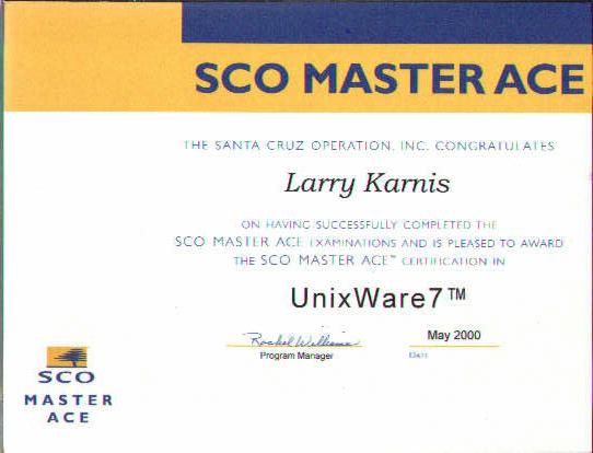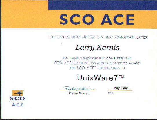 As a condition of maintaining my SCO UNIXWare Reseller Status, I earned my Certified UNIX Systems Administrator or CUSA certificate, my Advanced Certified Engineer or ACE certificate and finally my Master Advanced Certified Engineer or MACE certificate in UNIXWare 7.x in 2000.