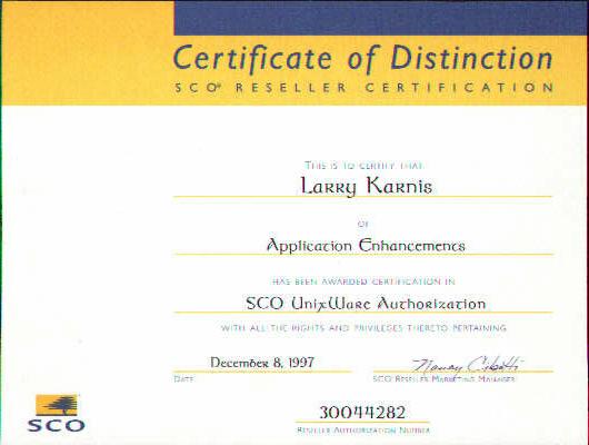 | This certificate provides authorization for me (and my company) to resell the entire UNIXWare product line. UNIXWare 7 Authorization is still required before an organization can purchase SCO UNIXWare products through distribution. SCO OpenServer reseller authorization is only granted to companies who have a UNIXware Advanced Certified Engineer on staff. |